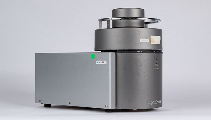 Nucleic Acid Processor, Light Cycler Polymerase Chain Reaction (PCR) machine. Silver-tone metal tabletop PCR machine is used to replicate viral RNA in blood samples for verification of Ebola diagnosis. Used by USAMRIID personnel at Liberian Institute of Biomedical Research to verify the symptoms-based diagnosis of local doctors for quarantine and proper care of Ebola patients in the 2014-2016 outbreak in West Africa. (National Museum of Health and Medicine Photo by Kevin Sommer-Giron)