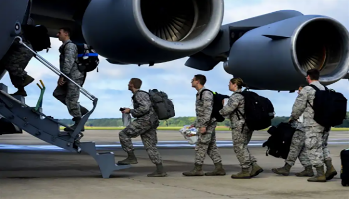Airmen assigned to the 633rd Medical Group board a C-17 Globemaster at Langley Air Force Base, Va., Sept. 26, 2014. The 633rd Medical Group packaged and delivered a modular medical treatment center, as part of a governmentwide effort to support humanitarian relief operations in Ebola-stricken African nations. (U.S. Air Force photo by Senior Airman Kayla Newnan)